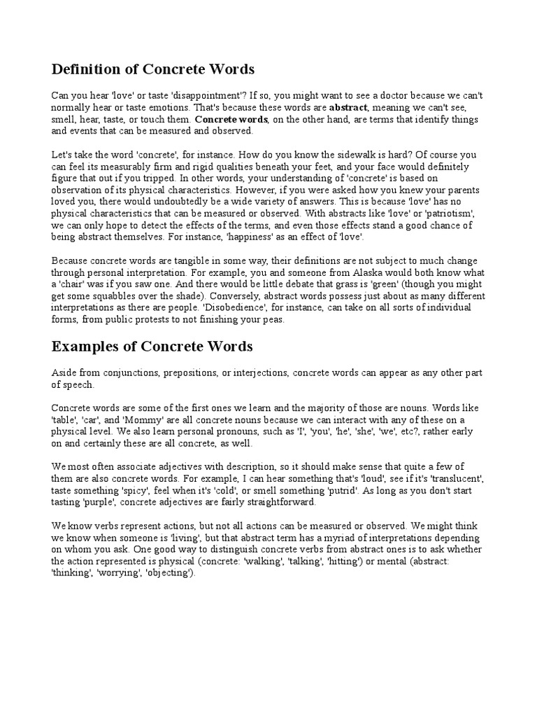 What Are Concrete Words at Buford Bell blog Concrete Words Definition Quizlet study with quizlet and memorize flashcards containing terms like irony, hyperbole, symbol and more. study with quizlet and memorize flashcards containing terms like concrete word, abstract words, denotation and more. concrete words refer to tangible items, things you can count, touch, name, identify in time. a concrete noun represents something that can be seen, touched, tasted,. Concrete Words Definition Quizlet.